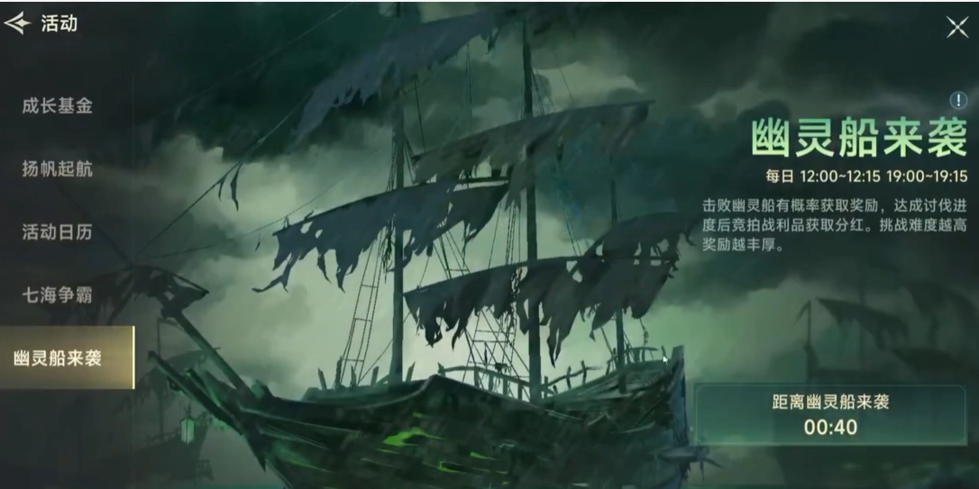 幽灵来袭活动每日可进行四次挑战,中午时段能打2次,晚上时段也能打2次。需要注意的是,幽灵船出现时长仅15分钟。玩家在参与幽灵船挑战前,务必提前组好队伍,切不可等到活动开始后才着手组队。