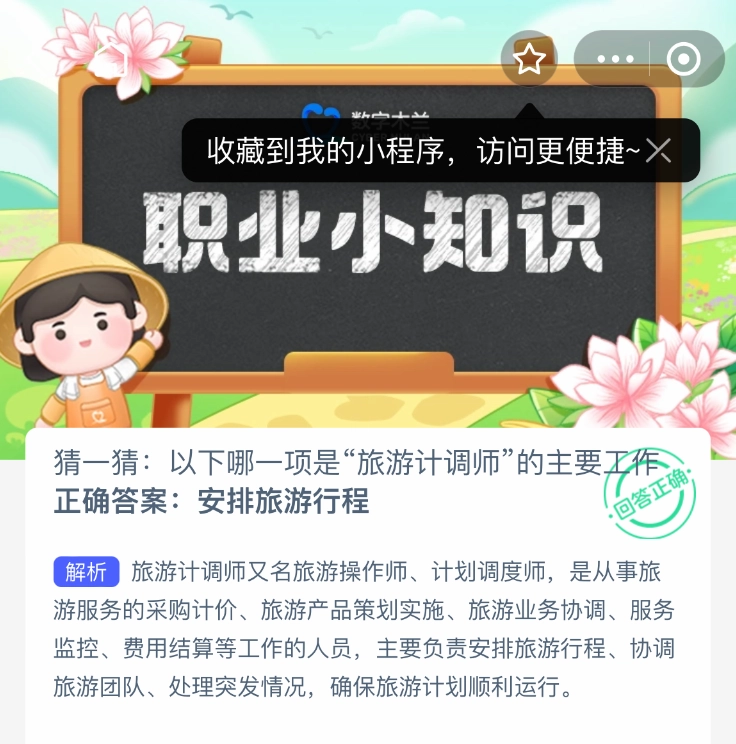 “旅游计调师”的主要工作是以下哪一项呢?这是支付宝蚂蚁新村2025年4月10日的题目。每天参与蚂蚁新村答题,既能学到有意思的职业小知识,又能提升木兰币的产出速度,助力小镇建设。今日的正确答案为【安排旅游行程】。旅游计调师也被称作旅游操作师、计划调度师,指的是那些从事旅游服务的采购计价、旅游产品策划实施、旅游业务协调、服务监控以及费用结算等工作的人员,其主要职责包括安排旅游行程、协调旅游团队、应对突发情况,以此保障旅游计划顺利推进。