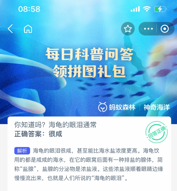 你晓得吗?海龟的眼泪一般是怎样的呢?支付宝蚂蚁森林神奇海洋2025年4月10日的问题已更新啦,今日的正确答案为:【很咸】。海龟的眼泪咸度颇高,甚至比海水的盐浓度还要高。海龟平日里饮用的皆是咸咸的海水,在它眼窝的后方存在一种用于排盐的腺体,简称为“盐腺”,而盐腺所分泌出的物质是浓盐液。