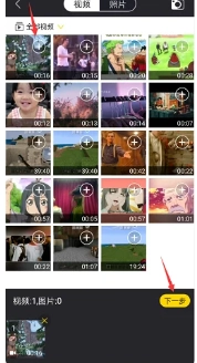 2、点击视频上的“+”,添加所需视频。视频添加完成后,点击“下一步”,将视频导入视频编辑页面。