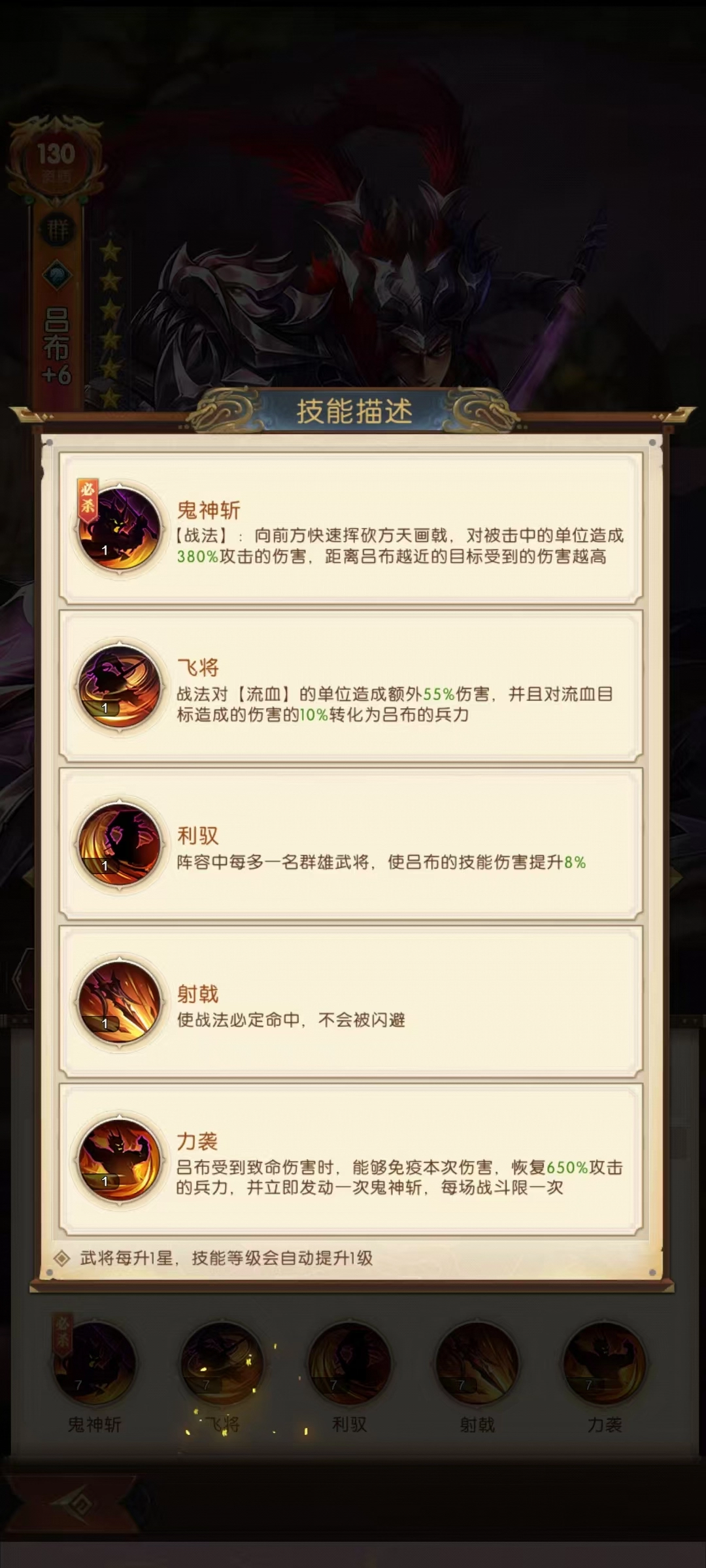 吕布的一技能“鬼神乱舞”属于主动技能,具备40%的发动概率。一旦触发,可对敌方部队造成高额的武力攻击伤害,伤害率高达200% ,同时自身将获得持续2秒的免疫状态,期间不会受到任何减益状态的影响。若自身武力与目标主将武力的差值大于50,伤害率会额外提升150%,瞬间爆发出极高的输出。而二技能“天下无双”是被动技能,当自身面对距离小于等于2的目标时,所造成的所有伤害会提高40%;部队受到来自距离大于1的所有伤害会降低20% 。但需注意的是,当受到大于等于3支部队攻击时,伤害提高的效果便会失效。
