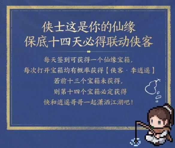 2、开启宝箱便有机会获取侠客【李逍遥】,连续签到14天则必定可得。