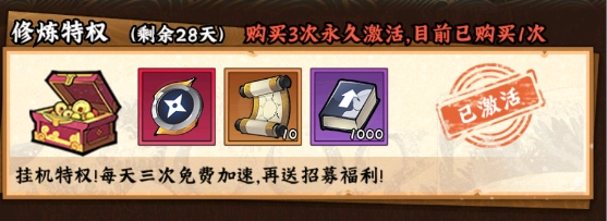 2. 修炼特权 - 30 元:若仅充值 30 元,挂机收益便成为关键考量因素,此时优先选择购买修炼特权。