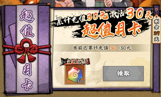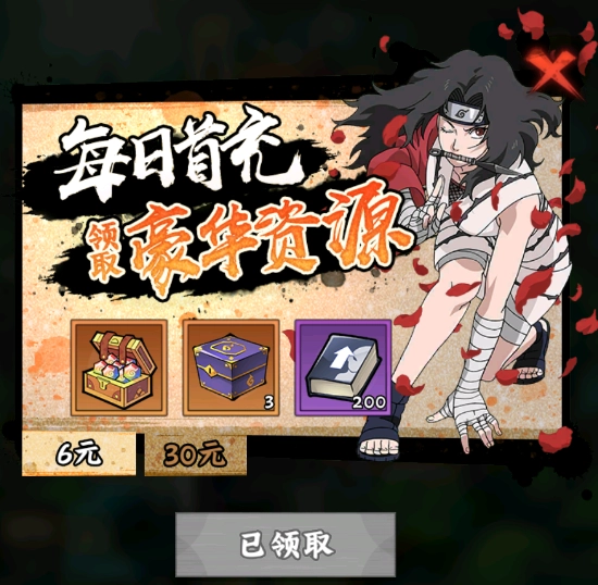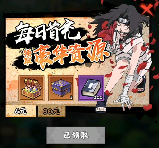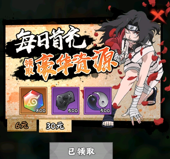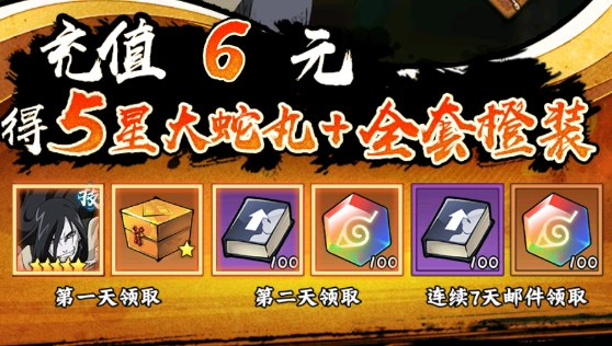 1. 首充礼包 - 6元首充礼包性价比颇高,能直接获取SSS五星大蛇丸。大蛇丸在前中期实力强劲,获取方式也简便,故而列为首选。而且,首充6元之后,接下来7天每天都能领取相应奖励,整体相当实惠。与此同时,充值6元还能激活每日充值豪礼,等于花6元就能拿到两个礼包!