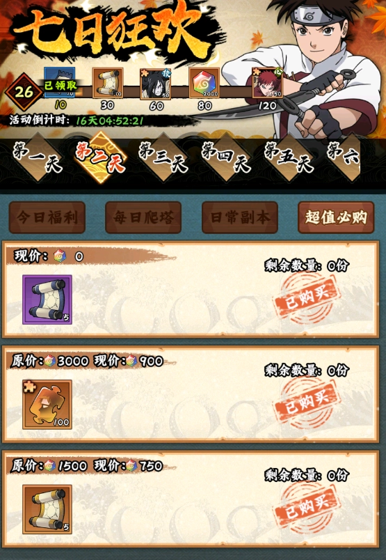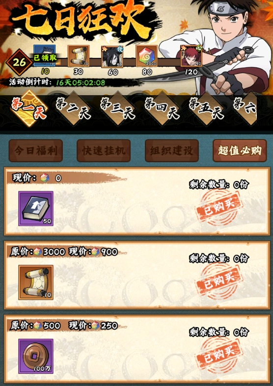 3. 七日狂欢期间有超值必购项目,这基本上是前七天一定要入手的,其中道具主要消耗忍币。对于微氪党而言,它是前期首选的消费点之一,千万不要错过!