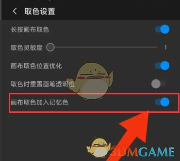 3、于“取色设置”界面中找寻“画布取色加入记忆色”这一选项,点击其后方的开关进行设置便可。