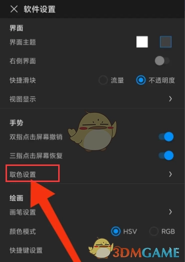 2、于“软件设置”界面里,点击“取色设置”选项,从而进入“取色设置”界面。