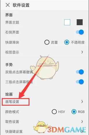 3、随后会进入“软件设置”界面,此界面主要划分为三大部分,即“界面”“手势”以及“绘画”这三大类,点击“绘画”选项下方的“画笔设置”选项。
