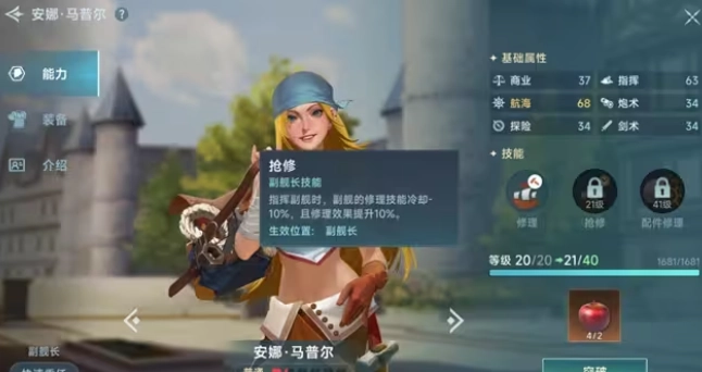 在她眼中,船用机械,像复杂的罗盘、控制风帆升降的绞车之类,都宛如精密的玩具。她熟知每一个机械部件的运作原理,能够娴熟地调试罗盘,保障航行方向精确无误。她对船装饱含热爱,拥有天马行空的想象力和独特的审美。依据不同的航行需求,她可以设计出新颖的船帆样式。玩家只要顺着游戏主线任务推进,就能顺利把这位满是活力与梦想的船匠招募到自己旗下。