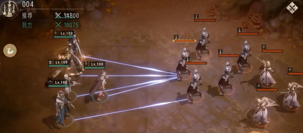 通天深渊的对战采用放置玩法。开局时,玩家可在己方区域随意放置角色,初始有5个放置位置。位置摆放策略并不难,把防御强、血厚的坦克类角色放在地盘最前端,如此能让坦克率先承受敌方怪物攻击,进而保护我方其他较脆弱的角色。