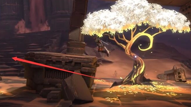 第三步:从高处跳下后,径直朝右前行,这时能看到一块黄色的能量石。将其击碎,随后迅速转身,向左奔跑。