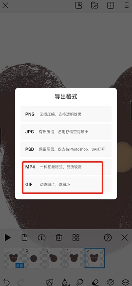 2、此时会弹出导出格式选项。要是在绘画过程中启用了【制作动画】工具,导出格式就会比平常多出MP4和GIF。要是你制作的是小型表情包或者动态图片,选择GIF就好;要是是稍长一些的视频,选择MP4就行,具体如图所示: