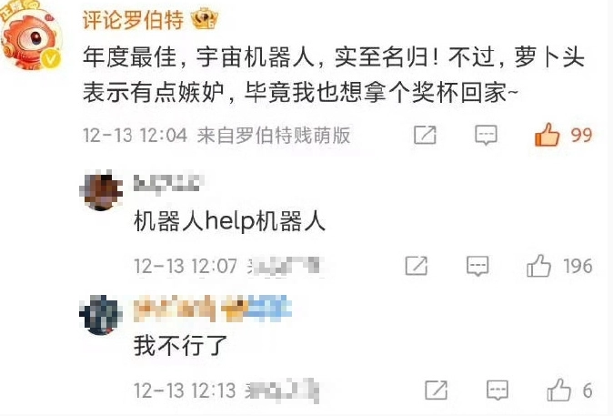 2、然而,微博官方机器人“评论罗伯特”却在评论区里大肆庆贺。