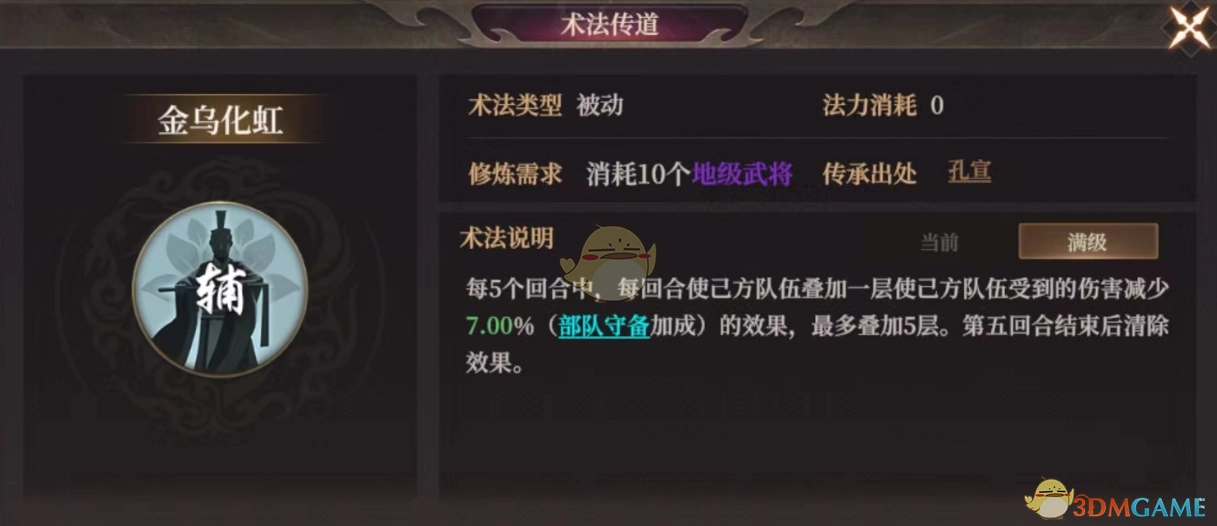 在每5个回合里,每个回合都会让己方队伍叠加一层效果,该效果能使己方队伍受到的伤害减少7.00%(部队守备加成),此效果最多可叠加5层。待第五回合结束,该效果将被清除。