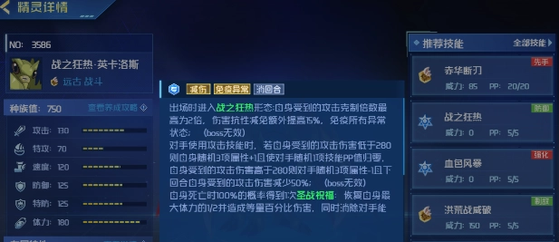 从属性角度而言,表现颇为强势,一经出场便即刻进入狂热状态,能直接将所受伤害减免至二分之一,此外,伤害抗性还会额外提高15%,并且具备免疫异常状态的功效。