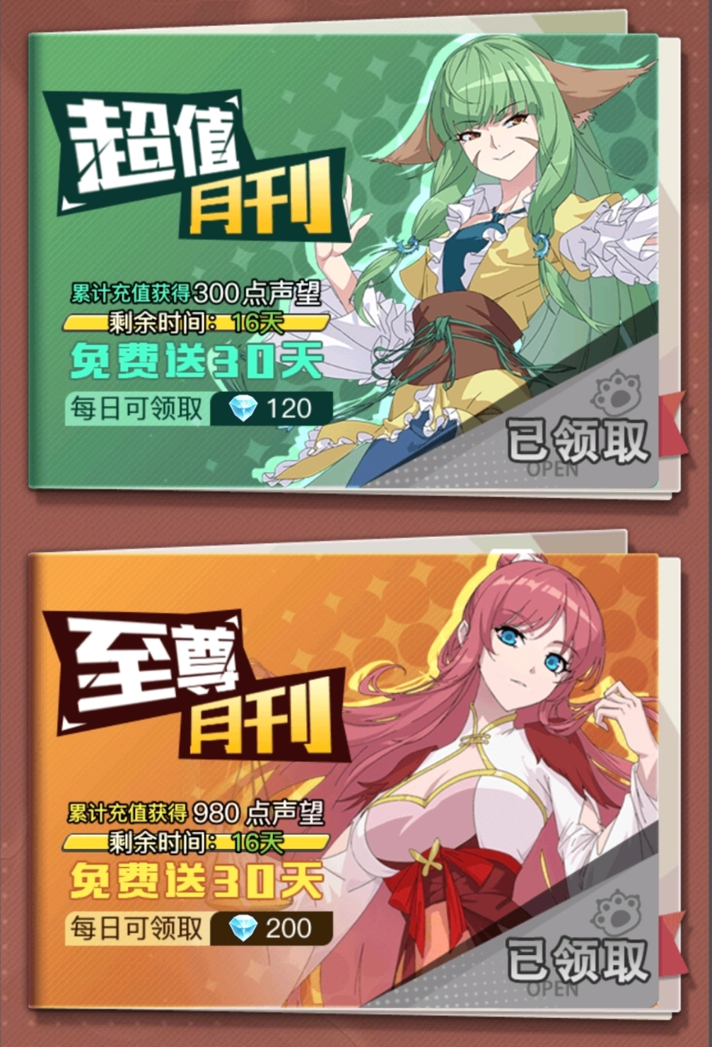 当累计充值达到300点声望,即可解锁超值月刊;若累计充值达到980点声望,则能解锁至尊月刊。解锁后,连续三十天,每天都能领取大量星钻!