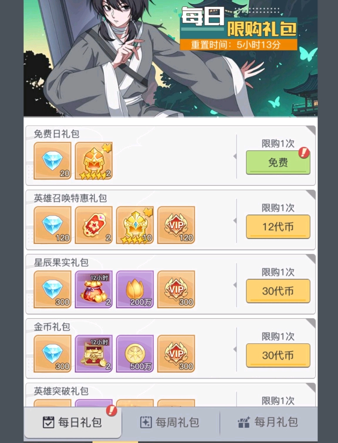 三千礼包商城每日、每周、每月会各自刷新三个阶段的礼包,而且这三个阶段都设有免费礼包可供领取~每日礼包和每月礼包分别包含20颗星钻、50颗星钻。