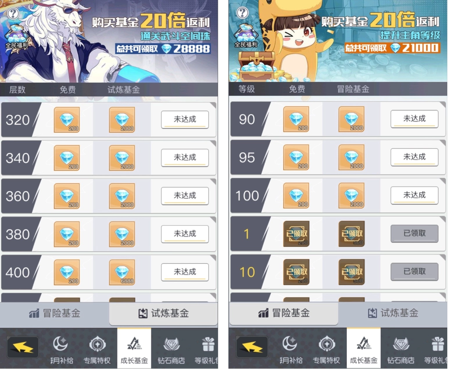 玩家提升自身等级,达成冒险基金要求后即可获得对应的星钻奖励。解锁高阶冒险基金能够获得更多星钻。