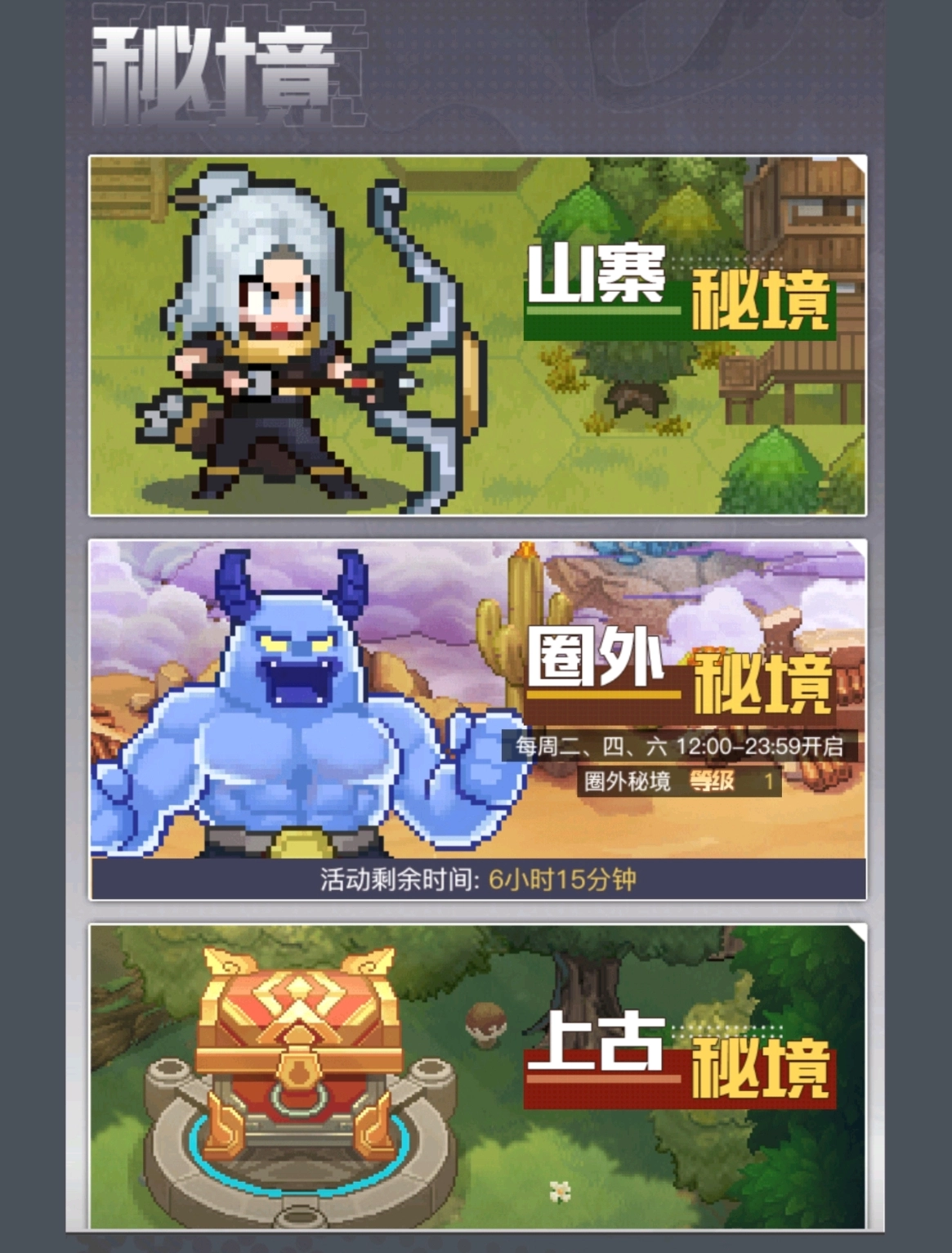 秘境玩法中,包含山寨秘境、圈外秘境、上古秘境等三个玩法,每一个玩法都可以获取大量钻石。