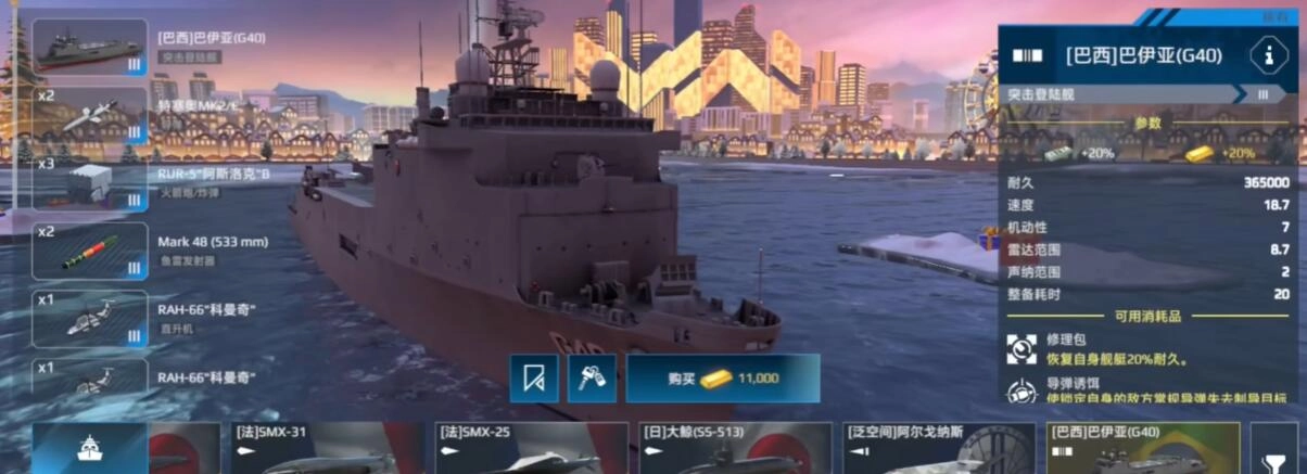 武器配备方面:以主炮与反潜作为核心。巴伊亚级主武器建议选择奥托76主炮(射速为1.2秒/发),亦或是155毫米高暴击炮。奥托76主炮能对脆皮船进行持续压制,155毫米高暴击炮则擅长贴脸爆发。导弹可在锆石(具备穿透防空能力)和东风 - 17(用于远程消耗)之中挑选。反潜必须携带ASW火箭炮,它单轮能清除潜艇30%的血量。防空采用铠甲 - M(负责拦截导弹)与海公羊(用于补刀飞机)混搭的方式,手动操作时优先锁定反舰导弹。鱼雷可选用旗鱼(适合贴脸爆发)或者89式(远程DPM较高) 。