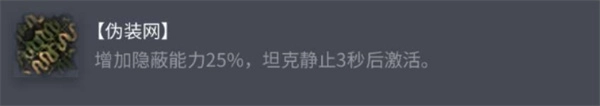 静止三秒后便会生效,给予25%的隐蔽加成。此特性适合执行诸如伏击、点灯但不射击这类隐蔽侦察任务,是轻型坦克的常规之选。