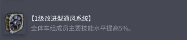 提升车组所有成员主要技能效率5%,能够强化车辆在视野、装填、操控等方面的整体性能,具有很强的通用性。
