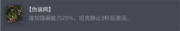 效果:当坦克静止达到3秒时触发,给予 +25% 的隐蔽加成。