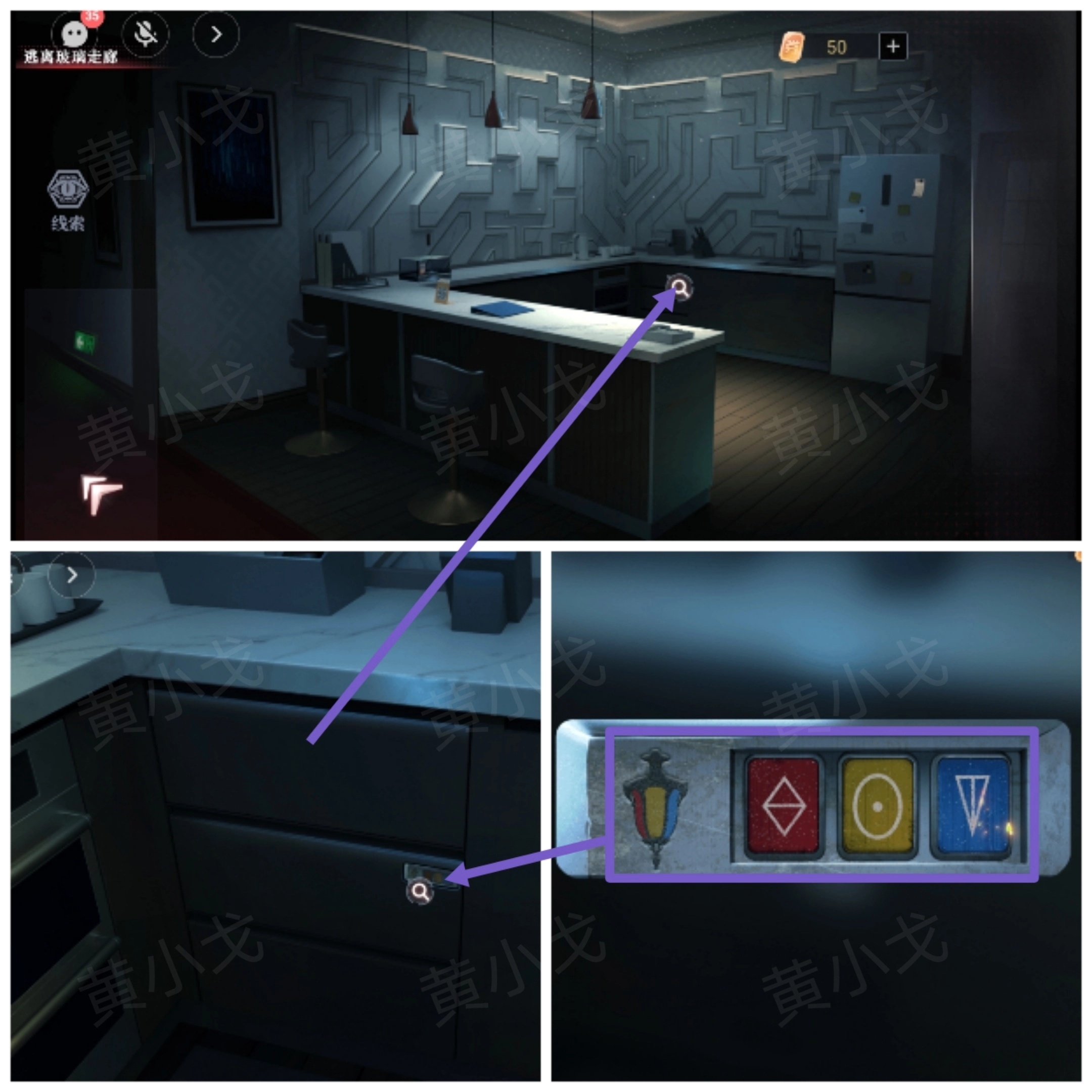 6. 轻点柜子第二层抽屉的密码锁,依据其给出的提示,同时参照[玻璃走廊]场景内灯光的颜色与符号线索,对密码锁进行相应调整。