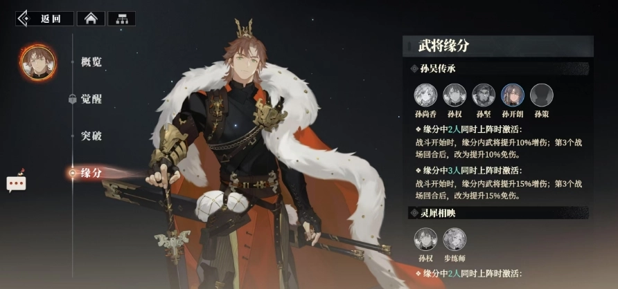 更值得一提的是,孙权作为3级武将觉醒天赋升级后,其提升行动条的效果提升至15%。而自带的孙吴传承羁绊效果,更是将这份力量推至巅峰。孙尚香、孙权、孙策、孙坚、孙开朗这几位武将间存在着割舍不断的联系,战斗默契宛如一体。当其中任意两人同时进入战场,战斗伊始,缘分内的武将就能感受到鼓舞,获得10%的增伤效果。
