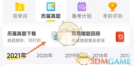 2. 切换至真题栏目,点击历届真题下载的选项。