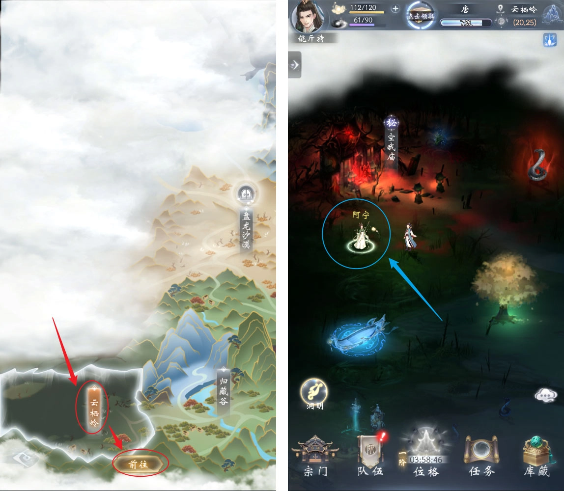 本篇要给大家分享《云深掌门路》里阿宁的心迹任务攻略。第一步,点开进入“世界”场景,要是你没在云栖谷,那就点击右上角的地图入口。接着选择云栖谷并点击前往,然后往地图左上角走,找到阿宁,和她进行对话。