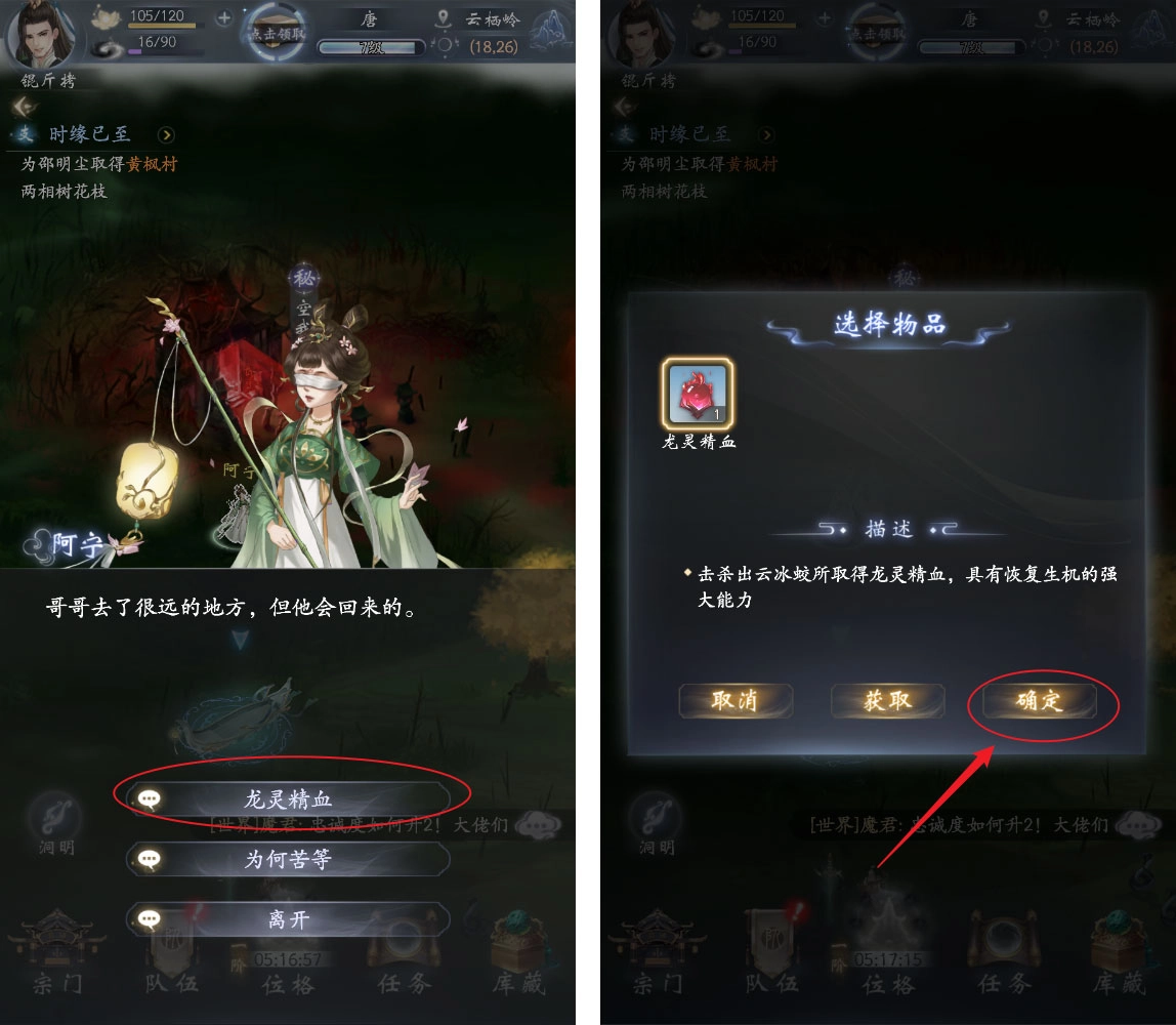 我们再次找到阿宁,与她对话,然后点击龙灵精血,点击确定后,任务完成。