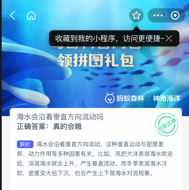2025年4月24日,支付宝蚂蚁森林神奇海洋的问题已更新。今日题目为:海水会沿着垂直方向流动吗?正确答案是:【真的会哦】。实际上,海水确实会沿着垂直方向流动,而这种垂直运动与密度差异、动力作用等诸多因素相关。