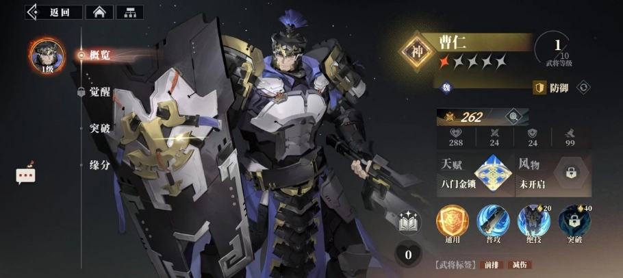 曹仁具备独特的能力,其效果能够提升友方的免伤,带来极为可观的坦度。只要与其他具有增免伤能力的武将合理搭配,就能在战场上构建起出色的防御态势。不仅如此,曹仁的攻击特性也别具一格,还附带自强化的奇妙效果。他的据守能力所赋予的格挡率,在战斗过程中会稳步提升,最终可攀升至40% 。而他自身携带的不破效果,更是必定触发格挡,只不过在承受主动攻击之后,该效果就会被移除。