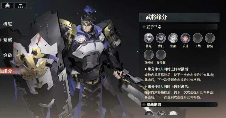 当缘分中有任意3人同时上场,每次武将成功格挡后,下一次攻击的暴击率会提升10%。要是这次攻击幸运地暴击命中,那么下一次受到攻击时,格挡率又会提升10%。而当缘分内任意5人同时上场,这份缘分的力量就会达到顶峰,格挡后攻击的暴击提升效果会增强到20%,暴击后的格挡提升幅度同样提高到20%。另外,曹仁也加入了鏖战荆襄这个缘分羁绊。