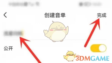 4、来到创建音单的界面,在相应位置输入音单名称,随后找到“完成”按钮即可。