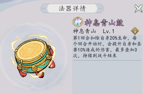 神息青山【Lv.3】法器在达到Lv.10时解锁特殊效果:第1回合会扣除自身20%的生命值。从每个回合开始,自身与圣兽造成的伤害会提升14%,该效果最多可叠加3次,且会一直持续到战斗结束。