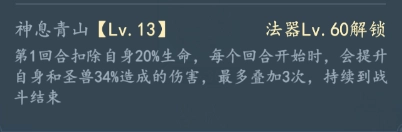 神息青山【Lv.13】法器在Lv.60解锁后,第1回合会扣除自身20%的生命值。此后,每个回合开始时,自身与圣兽造成的伤害都会提升34%,该效果最多可叠加3次,且会一直持续到战斗结束。