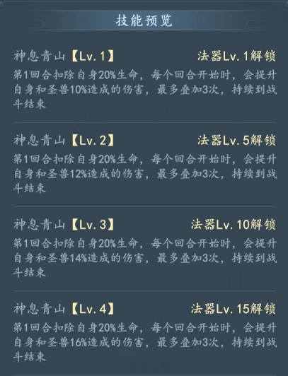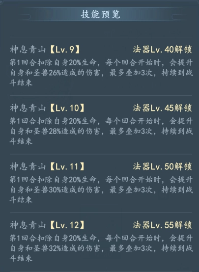 神息青山【Lv.10】:法器达到Lv.45解锁。第1回合时,自身扣除20%生命,之后每个回合开始,自身与圣兽造成的伤害会提升28%,该效果最多叠加3次,且持续至战斗结束。