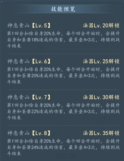 神息青山【Lv.8】法器Lv.35解锁第1回合扣除自身20%生命,每个回合开始时,会提升自身和圣兽24%造成的伤害,最多叠加3次,持续到战斗结束