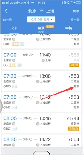 2、若车次以G开头,那就代表是高铁列车,所购买的即为高铁票。你需要先选择出发时间,然后查看右侧是否还有余票。