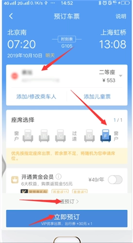 4、挑选乘车人员,选定座席,点击“立即预订”或者“普通预订”即可。
