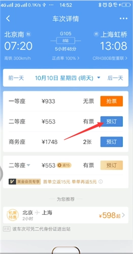 3、点击进入显示有票的列车,挑选座位等级,然后点击右侧的预订按钮。