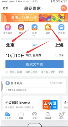 1. 开启高铁管家应用,在界面上挑选出发站点,接着挑选到达站点,再选定出发日期,最后点击“搜索火车票”按钮。