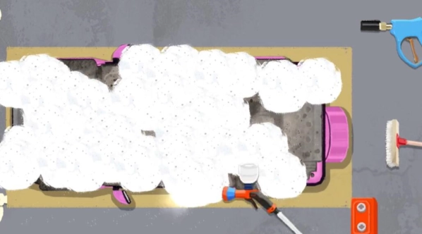 1、第一步,我们利用右边的工具来清洗汽车,只需按照数字顺序依次使用工具进行清洗就行。