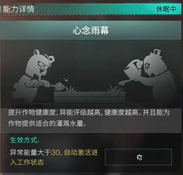 提高作物健康程度,异能评级越高,作物健康度就越高,同时还能为作物供应适宜的灌溉水量。