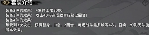 2件套能带来额外3000点生命值的加成,而3件套的效果是攻击时有40%几率使目标致盲。不过,从输出角度来看,这样的效果收益不算高,甚至还存在被敌人反震的风险。
