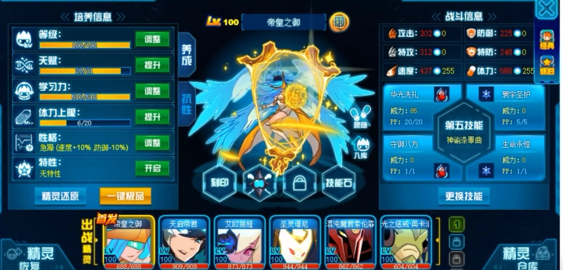 在控制方面,生命永恒与绝影夕阳给予了持续干扰以及生存恢复的双重支撑。当体力值低于一半时,生命永恒能获取先制 +2 的效果,还会强制让敌方在五回合内无法施展属性技能,并且该效果可延伸至敌方后续上场的精灵。此技能是以消耗体力为代价来实现全局掌控,是帝皇之御在残局对弈时的战术关键所在。而绝影夕阳属于持续型强化技能,它能在三回合内保证所有攻击必定命中,同时附带两回合的吸血功效,兼具稳定性与回复能力。