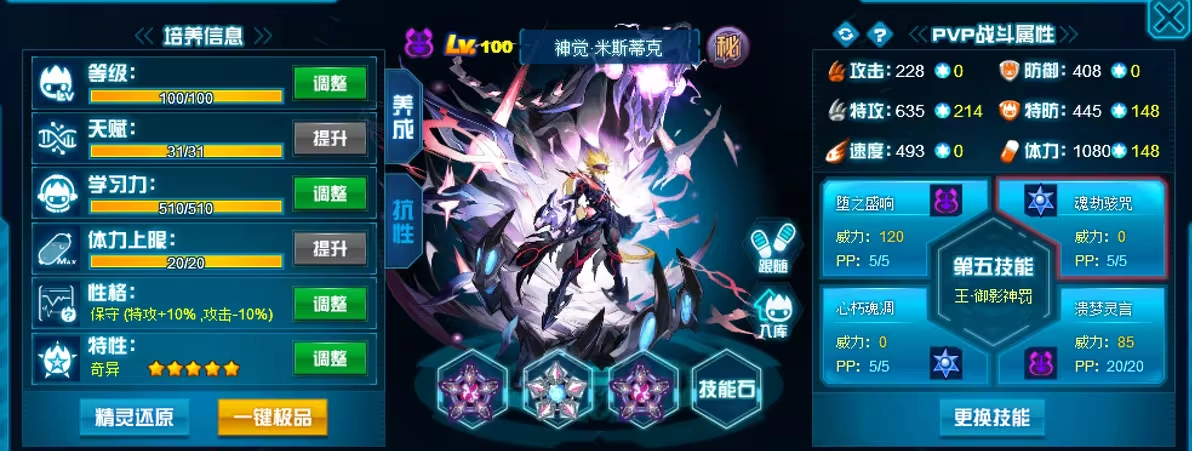 从种族值来看,特攻数值高达148,在当下精灵里处于中高档层次。再加上神秘系有着广泛的克制范围,这使得输出得以稳定。体力值为180,这为精灵多次登上战场提供了基本保障。速度为136 ,虽说不是特别突出,但凭借魂印的先制机制,还是能够争取到出手的机会。双防均为113 ,属于中等水平,不过依靠魂印对敌方能力的持续压制,依旧可以营造出可控的生存环境。 米斯蒂克的定位更侧重于中场控制与干扰。她并非依靠持续输出,而是每次登场时,凭借带来的封锁与削弱效果,为己方队伍争取操作空间。其魂印的设计几乎涵盖了当前对战中常见的强化与控制体系,能够有力地打乱敌方节奏,破坏他们的战术布局。