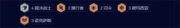 4名裁决战士、2位潜行者、2名司令、3个德玛西亚英雄、3个诺克萨斯英雄。(若存在转职情况,可对阵容进行适度调整)
